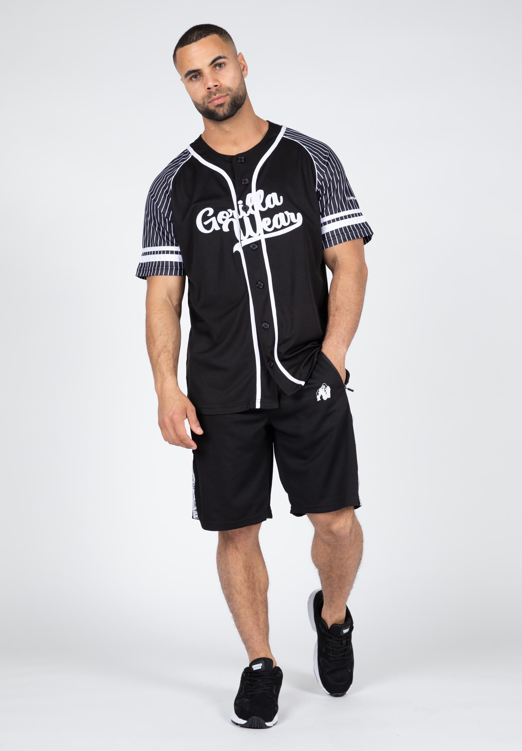 Our 82 Baseball Jersey provides a truly American look. This loose-fit top is a new design with our founding in the United States in 1982 in mind. It's made of breathable polyester mesh that keeps you cool and focused. The striped raglan sleeves, the full button closure, and striking Gorilla Wear logos create a rugged look. With the 82 Baseball Jersey, you can show everyone you're a member of #TEAMGORILLAWEAR!