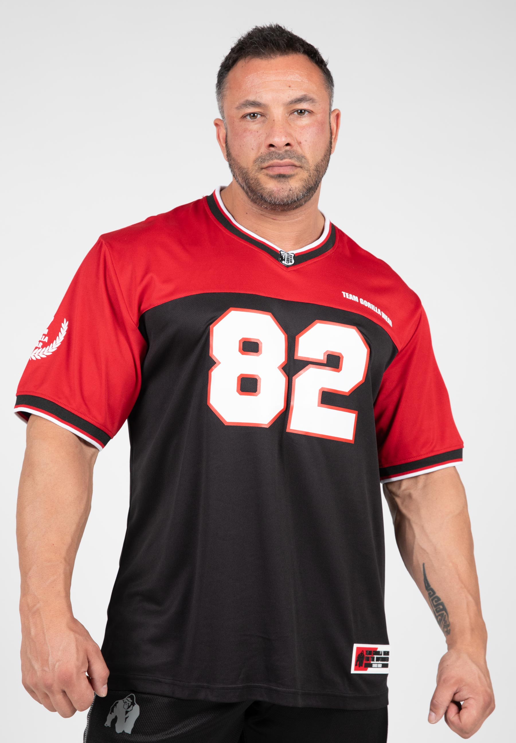Embrace the legacy of athletics with the Trenton Football Jersey. With a classic v-neck and wide elbow-length sleeves, this top not only oozes style but also provides superior comfort. Crafted from breathable polyester mesh, it ensures you stay cool and dry while hitting the gym. A sight to behold, the Trenton Football Jersey is adorned with multiple emblems and prints, including the iconic ‘Team Gorilla Wear’ phrase and a large 82 print that references the founding year of our legendary brand.