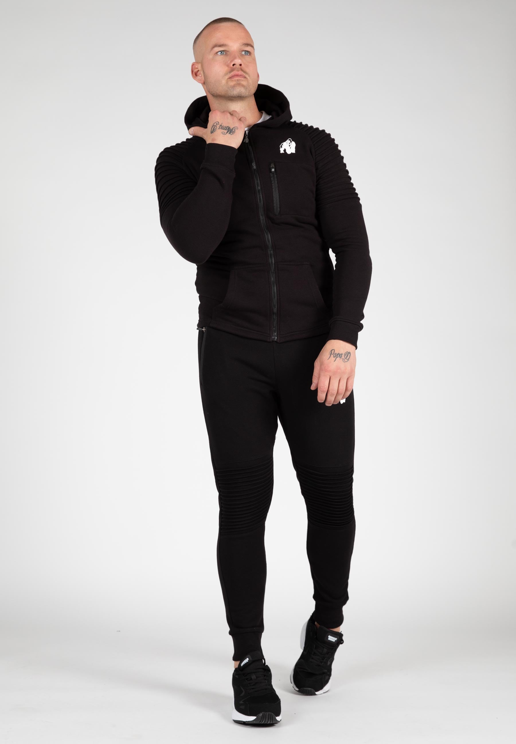 You can wear the Delta Pants both in the gym and while relaxing. The pants have ribbed knees that provide a cool look and allow for extra freedom of movement. They have a slim fit and are made of a blend of cotton and polyester, making them super comfortable to wear. They feature a drawstring waistband, zippered pockets, and of course the recognizable Gorilla Wear logo. Available in Army Green, Black, and Gray. Complete your outfit with the matching Delta Hoodie!