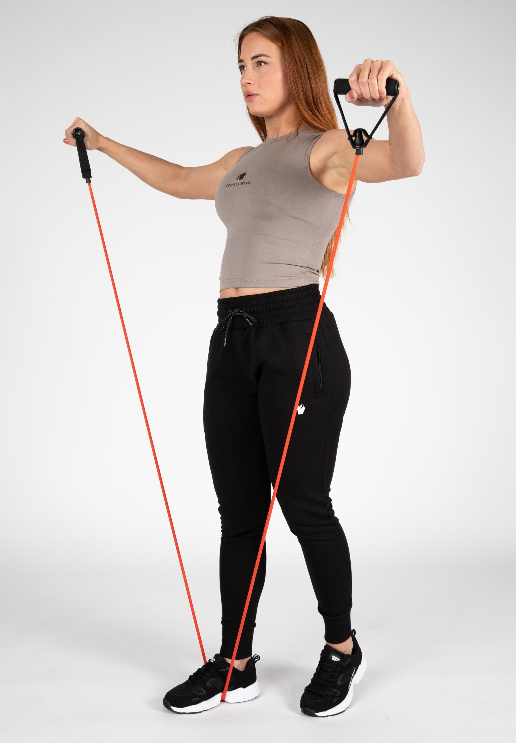 Look great while exercising with the Livonia Crop Top. This cropped tank top has a slim fit and is made of stretchy fabrics which makes it a pleasure to wear. The sleeveless and shortened design gives you the ability to move without any restrictions. Of course, it features screen-printed Gorilla Wear logos. The Livonia Crop Top pairs well with shorts as well as leggings and pants. It’s available in three colors, so you can alternate your gym outfits.